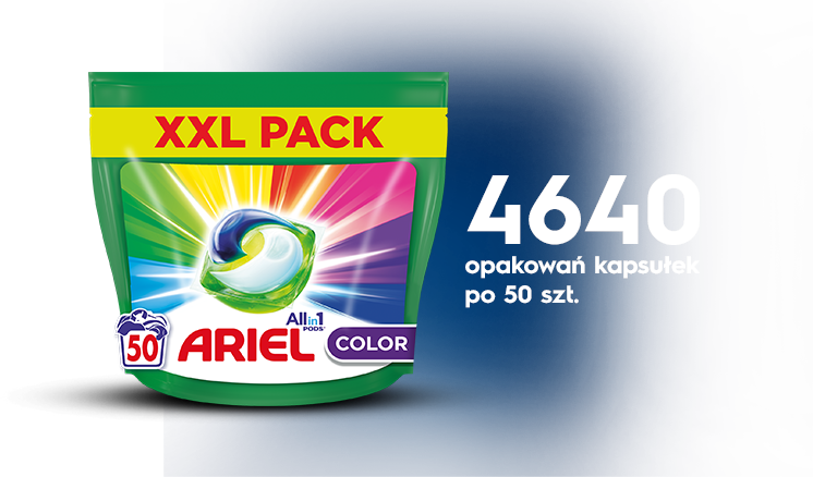 Zestawy detergentów w postaci kapsułek do prania marki Ariel przyznawane w ilości 200 kapsułek (4 opakowania kapsułek x 50 kapsułek) lub w ilości 100 kapsułek (2 opakowania kapsułek x 50 kapsułek).